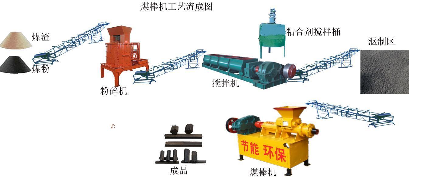 首先通過粉碎設(shè)備將原料進(jìn)行粉碎,然后通過攪拌機(jī)把煤粉和粘合劑攪拌一下,選用制棒機(jī)通過高溫螺旋擠壓使這些原料粘合在一起。擠壓出來的煤棒就能使用了。